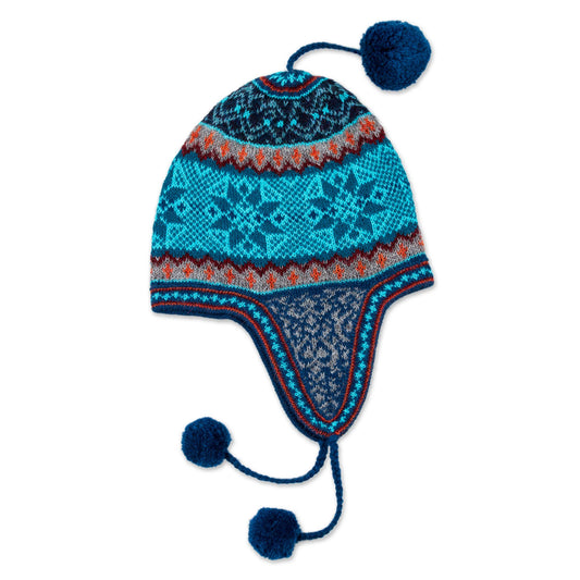 Andean Snowfall Alpaca Chullo Hat in Azure and Smoke from Peru